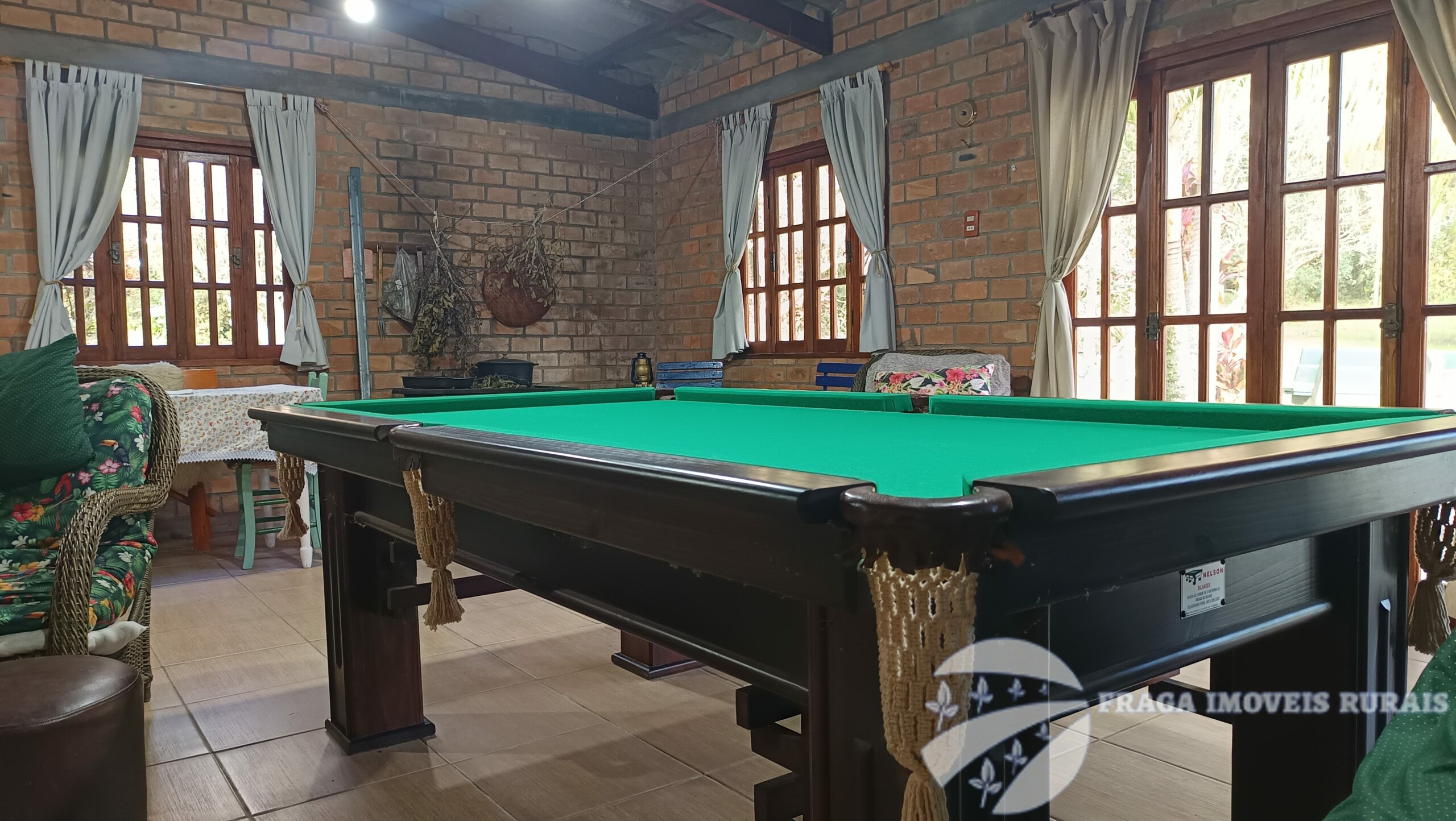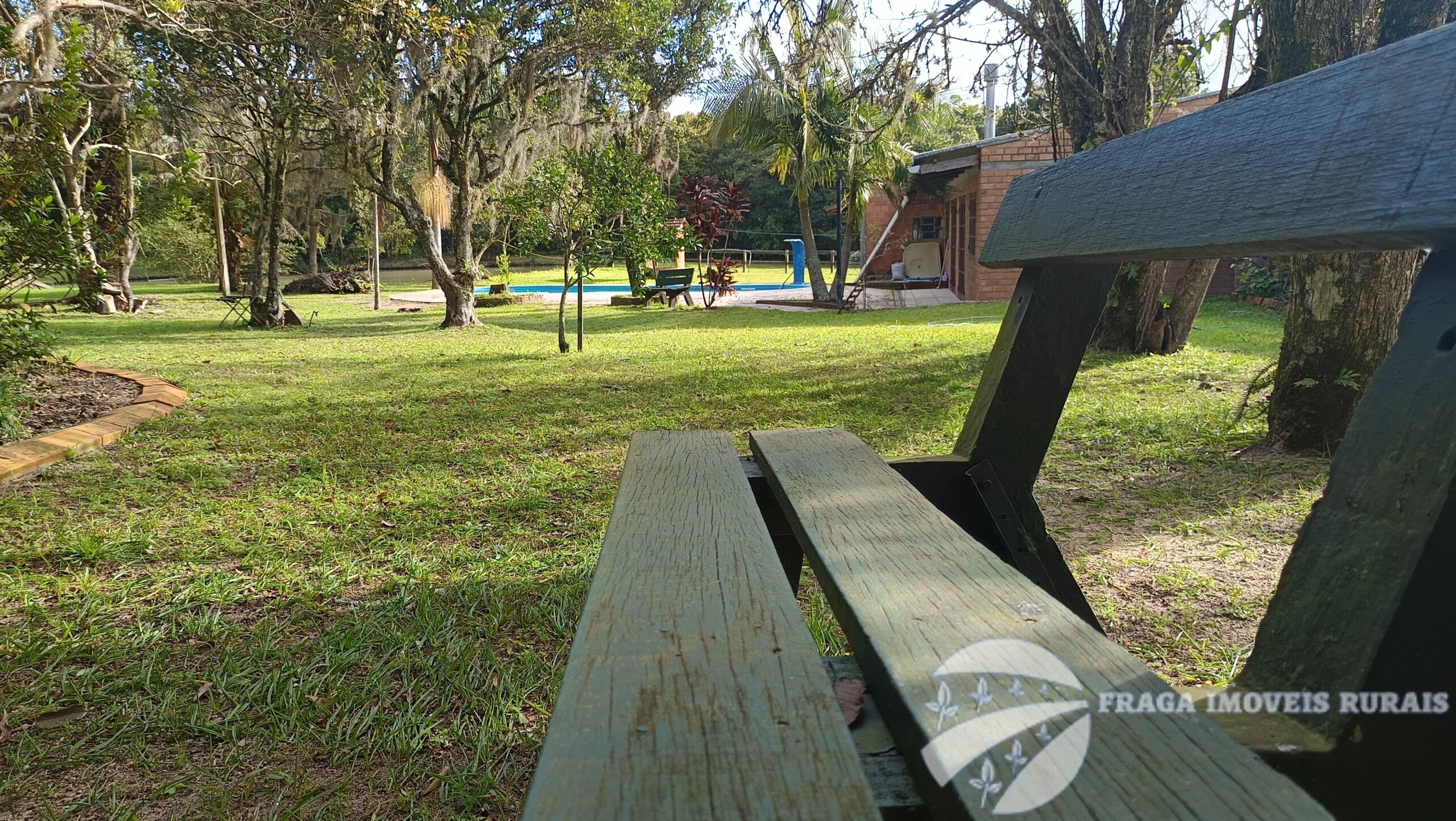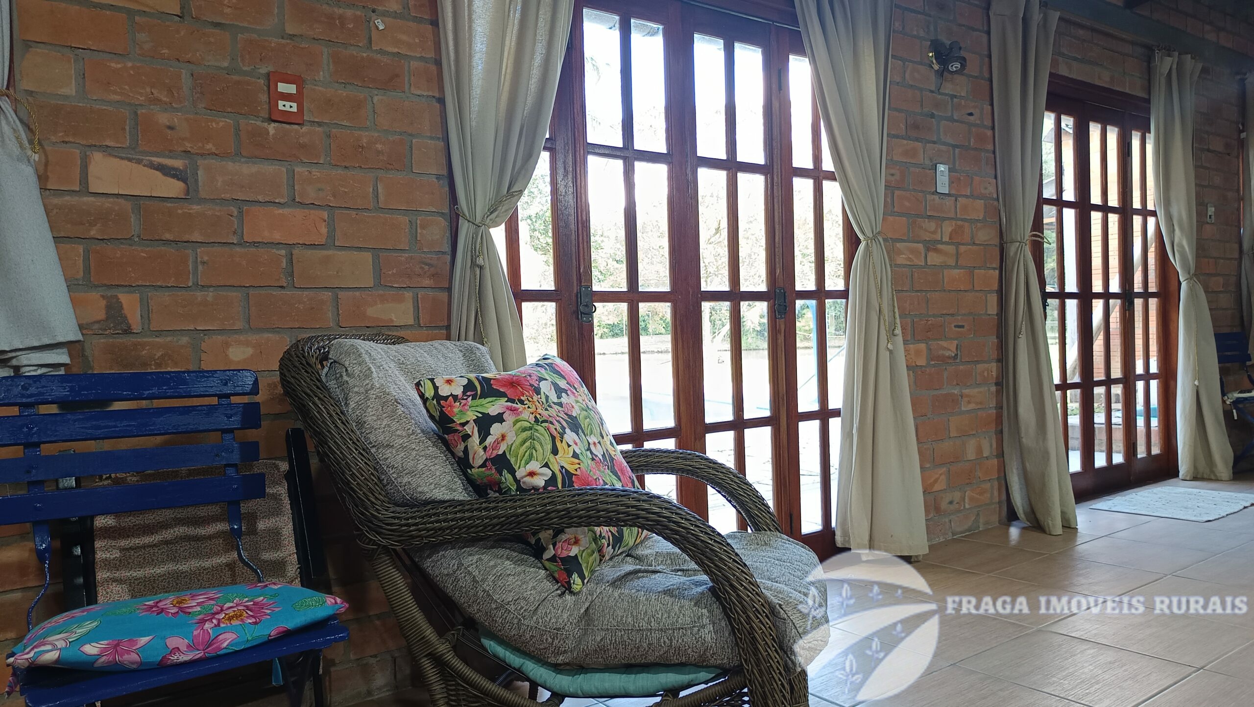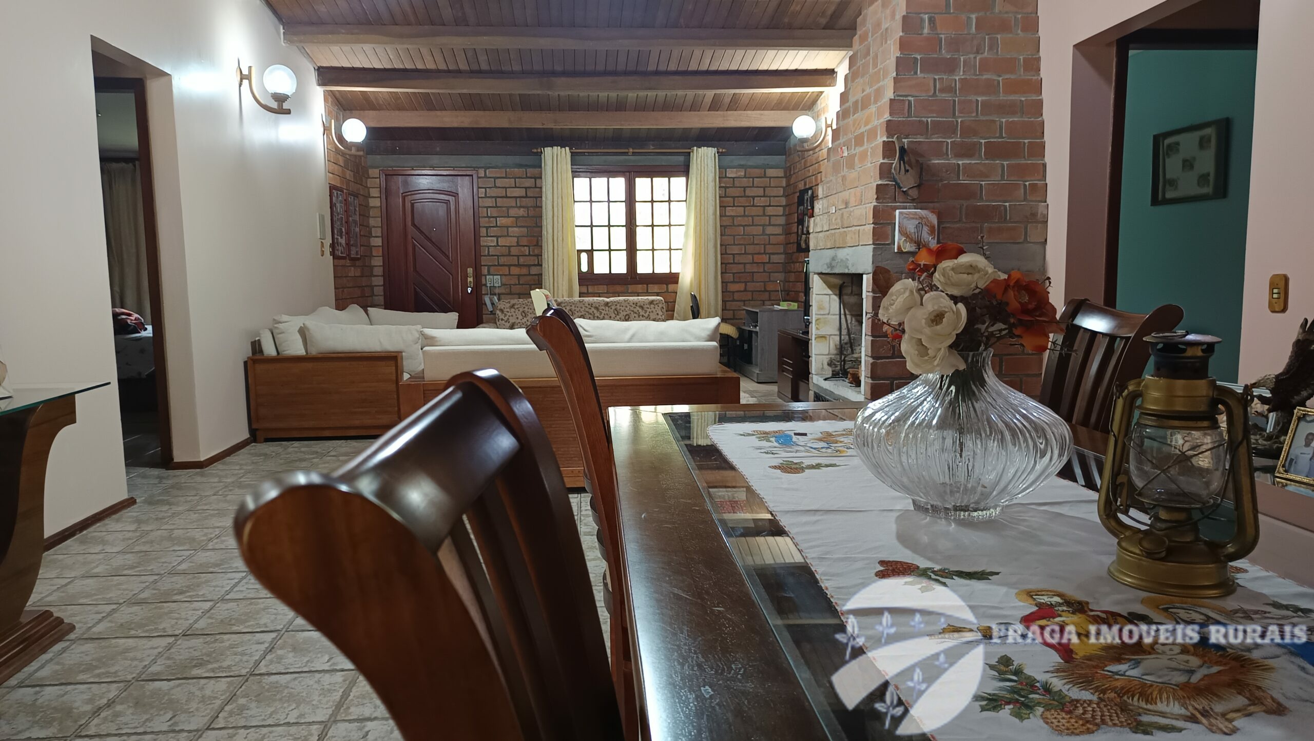 Com uma casa principal com 4 suites, sendo que uma delas tem uma hidromassagem, um living amplo com lareira, cozinha e um banheiro social. Junto a casa principal temos um salão de festas que fica de frente para a piscina, esse com lareira, churrasqueira, forno campeiro, cozinha montada e uma sala de jantar e banheiro. Também integrado ao salão de festas tem uma dependencia de empregada, com um dormitorio, lavanderia, banheiro e cozinha.