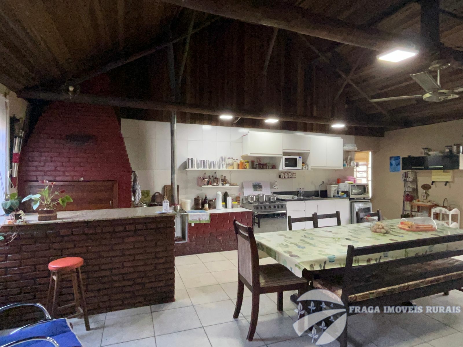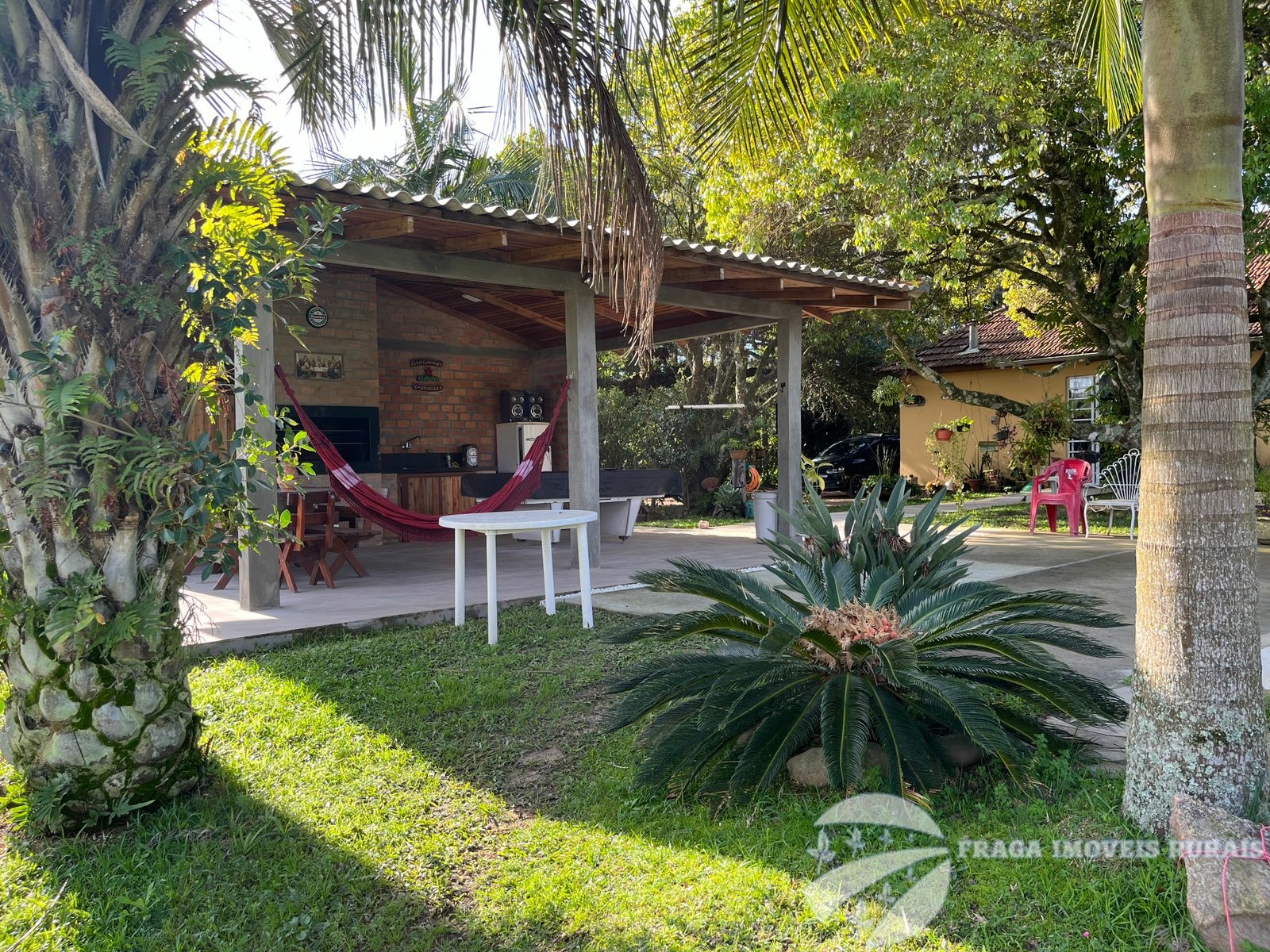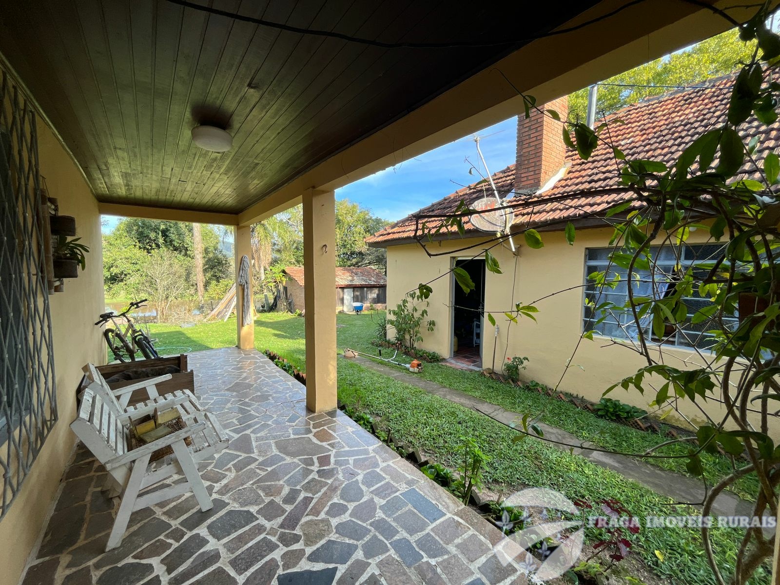 O sitio tem uma casa principal de 3 dormitorios, living amplo com lareira, cozinha grande e banheiro, um pequeno salão de festas com churrasqueira e lareira, banheiro, lavabo e 1 dormitório, com um estilo rustico e com um bom acabamento.
